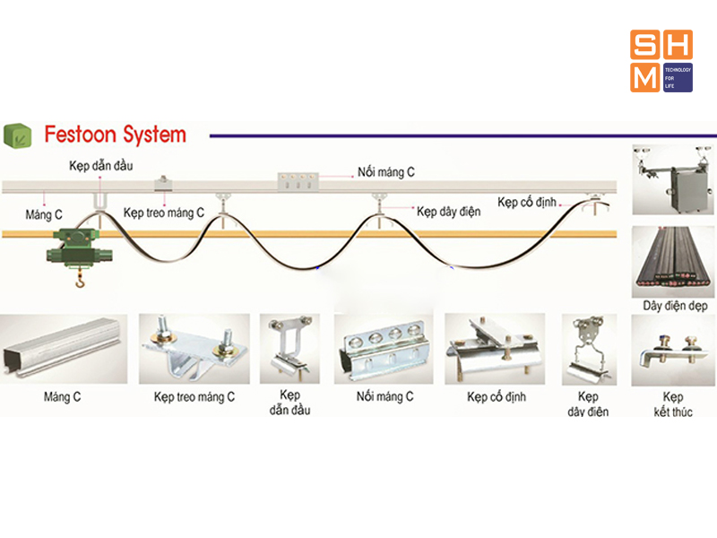 Hệ điện gồm có các bộ phận kẹp cáp, con lăn, máng C… được làm bằng vật liệu nhôm hoặc thép không gỉ, chịu ăn mòn tốt. Thiết bị dẫn điện là dây cáp điện dẹt có nhiều loại phù hợp với nhiều tính năng khác nhau của cầu trục, cổng trục. Có lõi được làm bằng đồng dẫn điện tốt. Vỏ ngoài dây cáp là chất liệu PVC có độ đàn hồi và chịu lực cao. Có khả năng chống dầu, chống acid, chống nước, chống tia UV, .. có thể làm việc ngoài trời hoặc trong những nơi có điều kiện làm việc khắc nghiệt.